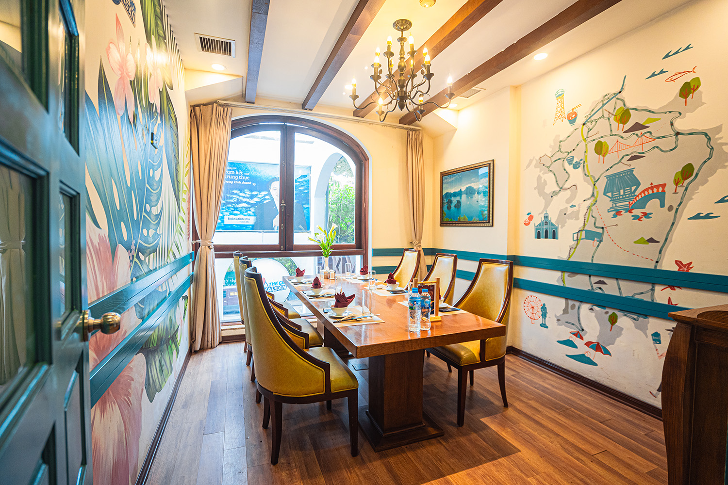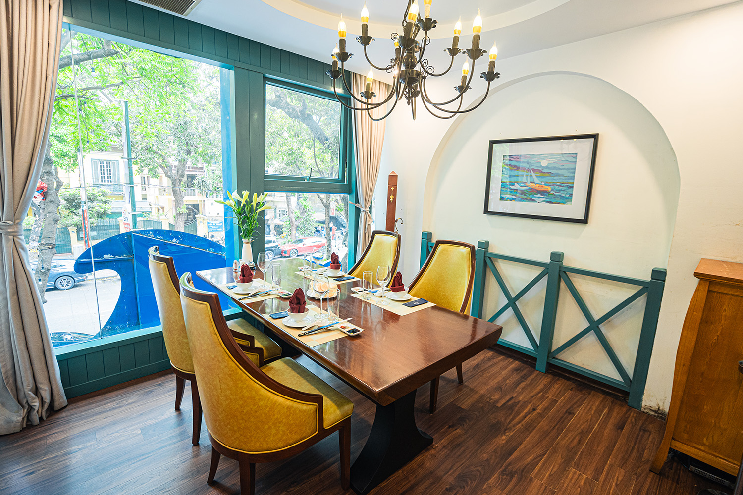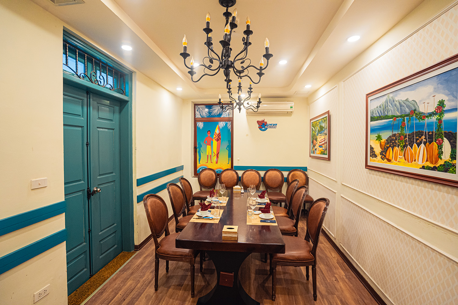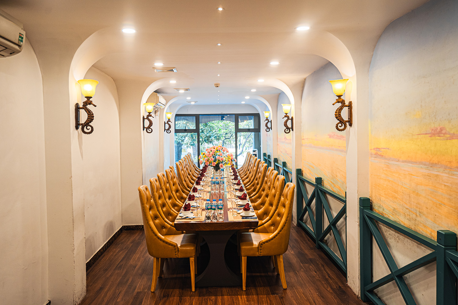 Lấy cảm hứng từ tinh thần Santorini, 36 Điện Biên Phủ mở ra một thế giới hải sản mang đậm vẻ đẹp thượng lưu Địa Trung Hải. Các phòng VIP riêng tư được thiết kế bởi tông màu xanh, đỏ chủ đạo gợi cảm giác sang trọng, cao cấp bậc nhất, trở thành trải nghiệm đặc biệt cho những buổi tiệc đẳng cấp.